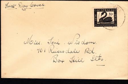 | 02 Aug 1954 FDC Centenary of First Postage Stamp In Western Australia SG277 3½d on private cover postmarked Box Hill Vic and addressed to Box Hill South Victoria