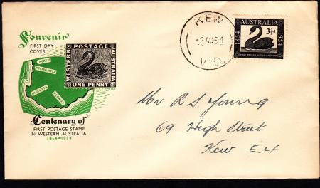 | 02 Aug 1954 FDC Centenary of First Postage Stamp In Western Australia SG277 3½d on Royal cover postmarked Kew Vic and addressed to Kew E.4. Victoria