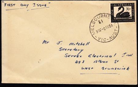 | 02 Aug 1954 FDC Centenary of First Postage Stamp In Western Australia SG277 3½d on private cover postmarked Melbourne Vic and addressed to West Brunswick Victoria