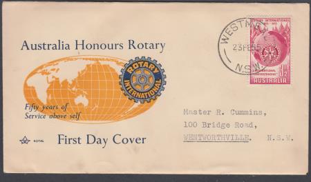 | 23 Feb 1955 FDC 50th Anniversary Rotary International SG281 3½d on Royal cover postmarked Westmead NSW and addressed to Wentworthville NSW
