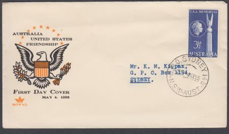 | 04 May 1955 FDC Australian-American Friendship SG283 3½d on Royal cover postmarked Sydney NSW and addressed to Sydney NSW