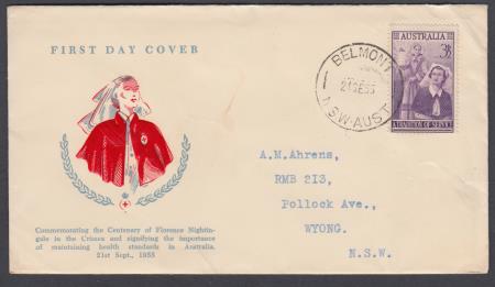 | 21 Sep 1955 FDC Nursing Profession Commemoration SG287 3½d on Wesley cover postmarked Belmont NSW and addressed to Wyong NSW