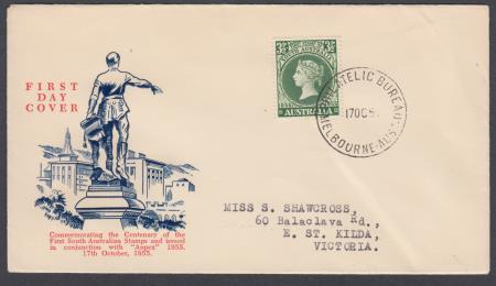 | 17 Oct 1955 FDC Centenary First South Australian Postage Stamp SG288 3½d on Wesley cover postmarked Philatelic Bureau Melbourne and addressed to East St. Kilda Victoria