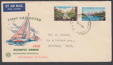 | 31 Oct 1956 FDC Olympic Games SG292 1s SG293 2s on Wesley Cover Service (WCS) Yachting cover postmarked Broken Hill NSW and addressed to Mitcham Victoria