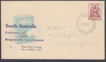 | 17 Apr 1957 FDC Cent Responsible Government South Australia SG296 4d on Royal cover postmarked Philatelic Bureau Melbourne Vic and addressed to South Caulfield Victoria