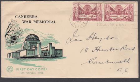 | 10 Feb 1958 FDC Australian War Memorial Set 2 SG302 5½d SG303 5½d Wesley cover