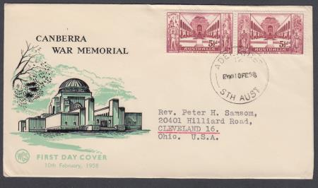 | 10 Feb 1958 FDC Australian War Memorial Set of 2 SG302 Sailor & Airman 5½d SG303 Soldier & Service Woman 5½d on Wesley Cover Service (WCS) cover postmarked Adelaide South Australia and addressed to Cleveland Ohio USA