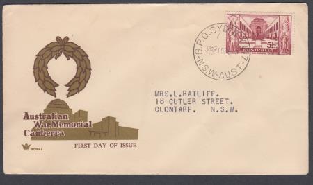 | 10 Feb 1958 FDC Australian War Memorial SG302 5½d on Royal cover