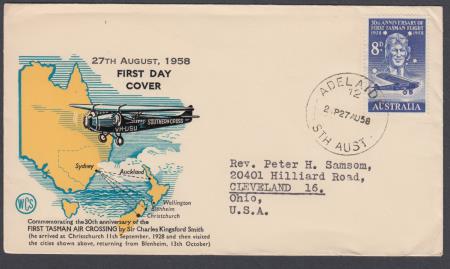 | 27 Aug 1958 FDC 30th Anniversary First Tasman Flight SG304 8d on Wesley Cover Service (WCS) cover postmarked Adelaide South Australia and addressed to Cleveland Ohio USA