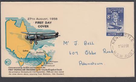 | 27 Aug 1958 FDC 30th Anniversary First Tasman Flight SG304 8d on Wesley Cover Service (WCS) cover postmarked Newcastle NSW and addressed to Adamstown NSW