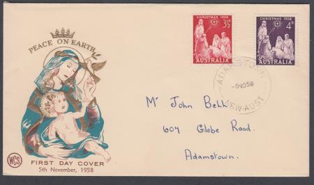 | 05 Nov 1958 FDC Christmas SG306 3½d SG307 4d on Wesley Cover Service (WCS) cover postmarked Adamstown NSW and addressed to Adamstown NSW