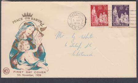 | 05 Nov 1958 FDC Christmas SG306 3½d SG307 4d on Wesley Cover Service (WCS) cover postmarked Chatswood NSW and addressed to Chatswood NSW