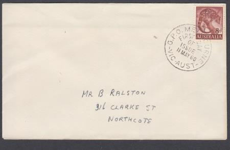 | 11 May 1960 FDC SG317 Tiger Cat 8d on Private cover postmarked Melbourne Victoria and addressed to Northcote Victoria