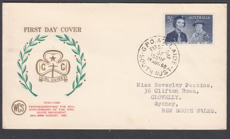 | 18 Aug 1960 FDC SG334 50th. Anniversary Girl Guides 5d on Wesley cover postmarked Adelaide South Australia and addressed to Clovelly NSW with date altered from 17th August 1960