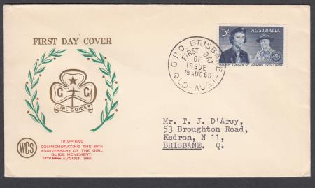 | 18 Aug 1960 FDC SG334 50th. Anniversary Girl Guides 5d on Wesley cover postmarked Brisbane Queensland and addressed to Kedron N.11. Queensland with date altered from 17th August 1960