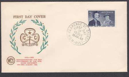 | 18 Aug 1960 FDC SG334 50th. Anniversary Girl Guides 5d on Wesley cover postmarked Clarence St Sydney NSW with date altered from 17th August 1960