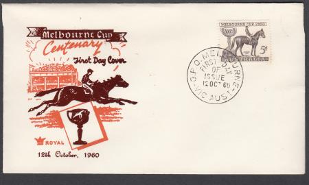 | 12 Oct 1960 FDC SG336 Centenary Melbourne Cup 5d on Royal cover postmarked Melbourne Victoria