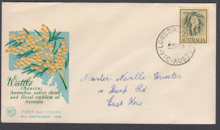 | 09 Sep 1959 FDC SG324 2s3d Green/Maize Wattle on Wesley cover