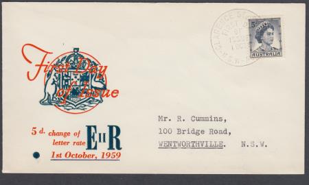 | 01 Oct 1959 FDC QEII SG 314 New Design 5d on Royal Cover postmarked Clarence St Sydney and addressed to Wentworthville NSW