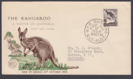 | 21 Oct 1959 FDC SG318 Kangaroo 9d on Wesley cover postmarked Brisbane Queensland and addressed to Kedron N.11. Brisbane