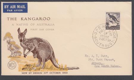 | 21 Oct 1959 FDC SG318 Kangaroo 9d on Wesley cover postmarked Adelaide South Australia and addressed to Albury NSW