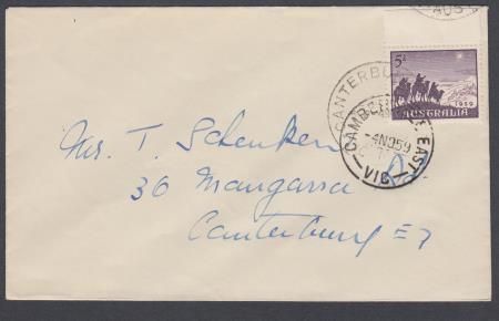 | 04 Nov 1959 FDC SG333 Christmas 5d on Private cover postmarked Canterbury and Camberwell East Victoria and addressed to Canterbury E.7. Victoria