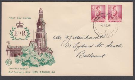 | 02 Feb 1959 FDC QEII New Design SG313 4d Pair on Wesley cover postmarked Ballarat Victoria and addressed to Ballarat Victoria