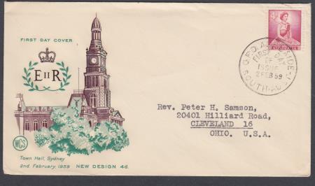 | 02 Feb 1959 FDC QEII New Design SG313 4d on Wesley cover postmarked GPO Adelaide First Day Of Issue addressed to Cleveland Ohio USA