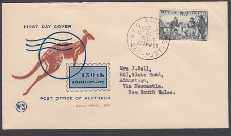 | 22 Apr 1959 FDC SG331 4d 150th. Anniversary Australian Post Office on Wesley Cover Service (WCS) cover postmarked Brisbane Queensland and addressed to Adamstown via Newcastle NSW