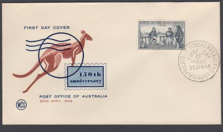| 22 Apr 1959 FDC SG331 4d 150th. Anniversary Australian Post Office on Wesley Cover Service (WCS) cover postmarked Philatelic Bureau Melbourne