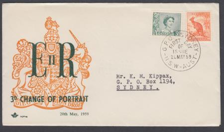 | 20 May 1959 FDC SG311 QEII New Design 3d and ½d Kangaroo on Royal cover
