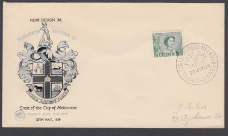 | 20 May 1959 FDC SG311 QEII New Design 3d on Wesley Cover Service (WCS) cover postmarked Philatelic Bureau Melbourne and addressed to J Bolin