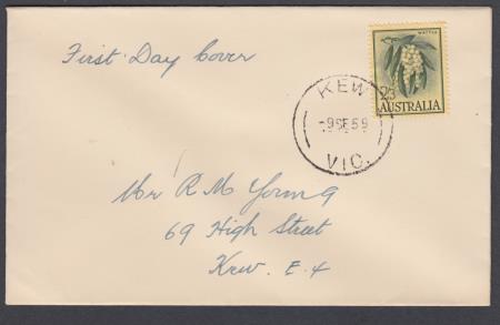 | 09 Sep 1959 FDC SG324 2s3d Green/Maize Wattle on Private cover postmarked Kew Vic and addressed to Kew E.4. Victoria