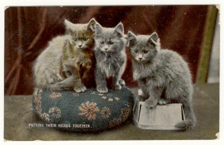 | Wildt & Kray Series 1000F postcard showing three kittens captioned "Putting Their Heads Together". Used, postmarked Melbourne 13.9.07.