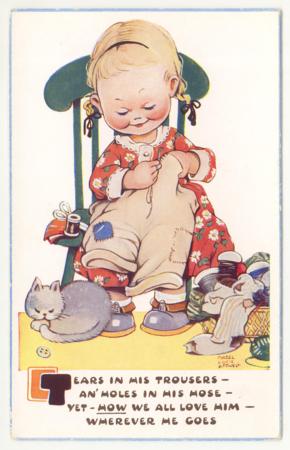 | Valentine's Mabel Lucie Attwell postcard #1414 captioned "Tears in his trousers an' holes in his hose, yet - how we all love him wherever he goes". Unused, minor wear to corners and edges.