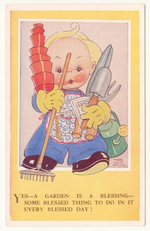 Valentine's Mabel Lucie Attwell postcard #4582 captioned "Yes - a garden is a blessing - some blessed thing to do in it every blessed day!".