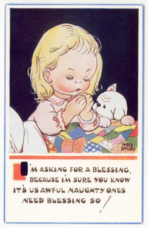 | Valentine's Mabel Lucie Attwell postcard #5501 captioned "I'm asking for a blessing, because I'm sure you know, it's us awful naughty ones need blessing so!". Unused, minor edge wear.