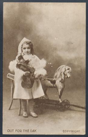 | Black and white postcard 'Out for the day'. Girl and her doll.