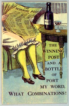 | Postcard captioned "The Winning Post and a Bottle of Port. My word, What Combinations!" unused.