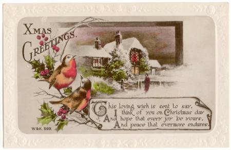 Wildt & Kray embossed border postcard featuring a snow scene with Robins and Christmas verse. Used for note dated 1929.