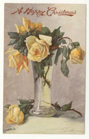 Raphael Tuck & Sons Oilette Postcard No. 9679 'When the Roses are in bloom' artist signed F Lohmann, with Christmas greetings. Writing on back dated 1914, some discoloration.