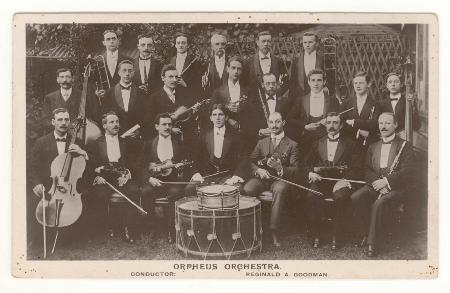 | Vintage photo postcard showing the Orpheus Orchestra with their conductor Reginald A. Goodman. Used, postmarked S.Norwood S.E. 5 May 1921. Some small dirt spots and minor faults.