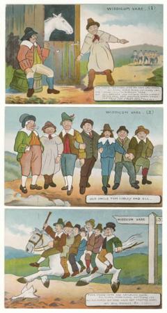 | Vintage postcard set published by Chapman & Son, Photographic Publishers, Dawlish. Cards are titled "Widdicum Vare" with lyrics about Tam Pierce's grey mare and old uncle Tom Cobley. This folk song is normally known as Widdecombe Fair, with Tom Pearce (or Pearse) being the owner of the grey mare. Interesting set. Cards are unused, some wear around edges.