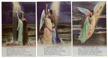 Bamforth Song Card series 4866 'The Rock of Ages' set of three cards. Unused, hole in second card, some drawing pin marks at tops and bottom.