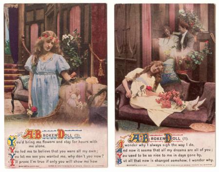 Bamforth Song Card series 4954 'A Broken Doll' first and third cards. Unused, some minor faults.