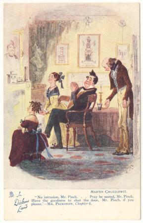 Raphael Tuck & Sons Oilette Postcard 7058 'In Dickens Land' featuring an extract from Martin Chuzzlewit. Unused, bumped corners, discoloration on back.