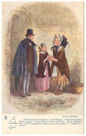 Raphael Tuck & Sons Oilette Postcard 7059 'In Dickens Land' featuring an extract from Little Dorrit. Unused, slightly damaged lower right corner and bottom edge.