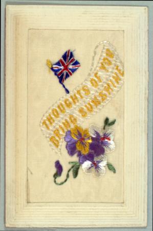 | WWI French Embroidered Silk postcard, with Pansies and Union Jack, text 'Thoughts of You Bring Sunshine', J.M.T.