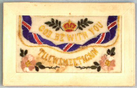 | WWI French Embroidered Silk pocket postcard, with a Crown and Ribbon in British Colours, and the text 'God Be With You Until We Meet Again', Visé, Paris