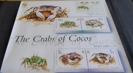 | Australia Post Poster 2000 (20 Jun) Cocos-Keeling Is. "The Crabs Of Cocos" displaying First Day Cover and Set Of 4 Stamps 5c Purple Crab Little Nipper 45c Horn-eyed Ghost Crab Smooth-handed Ghost Crab (approx 520mm wide x 440mm deep)